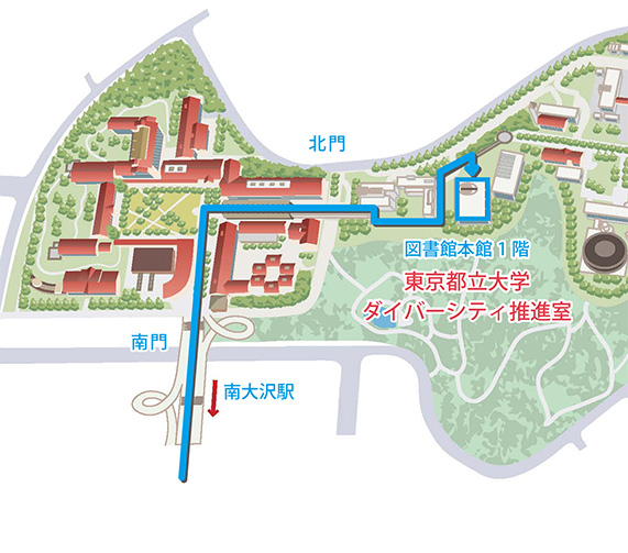 京王線相模原線「南大沢」駅改札口から徒歩約5分 ※改札口を出て右手に緑に囲まれたキャンパスが見えます。