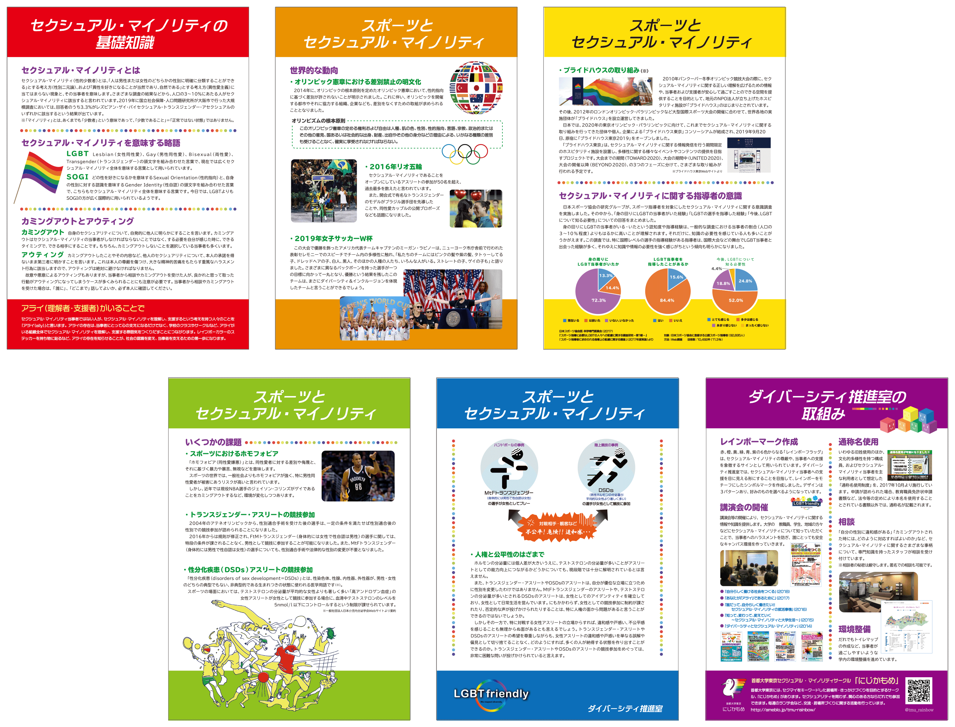 2020オリンピック・パラリンピック東京大会を間近に控え、スポーツとセクシュアル・マイノリティに関する課題への注目が高まっています。 そこで、ダイバーシティ推進室では、スポーツとセクシュアル・マイノリティに関する諸問題を解説するポスターを作成しました。 ポスターは6枚一組で、セクシュアル・マイノリティの基礎知識をはじめ、スポーツとセクシュアル・マイノリティをめぐる課題や世界的な動向、日本スポーツ協会スポーツ医科学専門委員会による調査結果などを紹介しています。