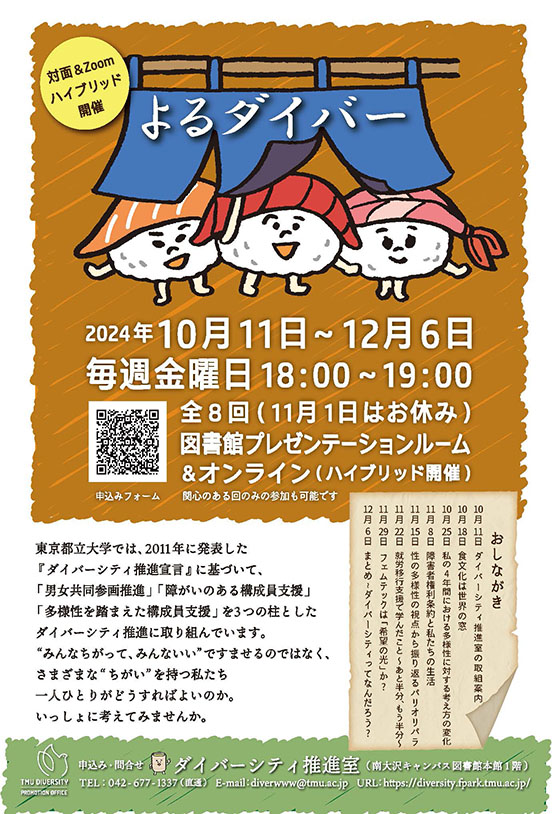 東京都立大学では、2011年に発表した『ダイバーシティ推進宣言』に基づいて、 「男女共同参画推進」「障がいのある構成員支援」「多様性を踏まえた構成員支援」を3つの柱としたダイバーシティ推進に取り組んでいます。
