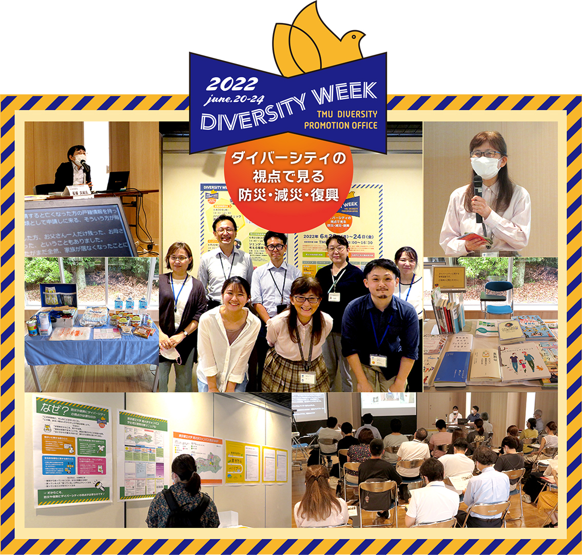 このイベントは、「男女共同参画の推進」「障がいのある構成員の支援」「多様性を踏まえた構成員支援」という、ダイバーシティ推進室の3つの取組を広く知ってもらうことを目指し、2021年度から始まったものです。第2回目となる今年度は「ダイバーシティの視点で見る防災・減災・復興」をテーマとし、講演会や映画の上映会を対面形式で開催しました。また、会場となったTMUギャラリーには、ダイバーシティ推進室の取組や、なぜ防災にダイバーシティの視点が必要なのかを解説したポスターを展示したほか、学内所管部署の協力を得て、都立大の防災マップや備蓄している防災用品の展示も行いました。