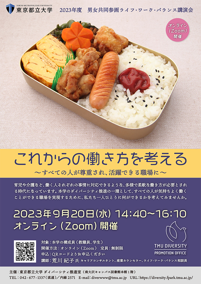 キャリア・コンサルタントで、本学のライフ・ワーク・バランス相談員の荒川紀子先生を講師に、多様な働き方をテーマとした講演会を開催します。育児や介護など、働く人それぞれの事情に対応できるような、多様で柔軟な働き方が必要とされているいま、すべての人が気持ちよく働くことができる職場を実現するために、私たち一人ひとりに何ができるかを考えてみませんか。