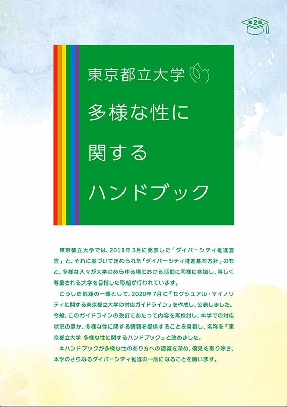 ダイバーシティ推進室では、2020年7月に『セクシュアル・マイノリティに関する東京都立大学の対応ガイドライン』を公表しました。それ以来、学内での対応状況の把握が進んだことや、社会的な環境の変化などを踏まえ、今般、このガイドラインの改訂することとなりました。改訂にあたり内容を再検討し、本学での対応や相談体制のほか、広く多様な性に関する情報を提供することを目指し、名称を『東京都立大学 多様な性に関するハンドブック』と改めました。